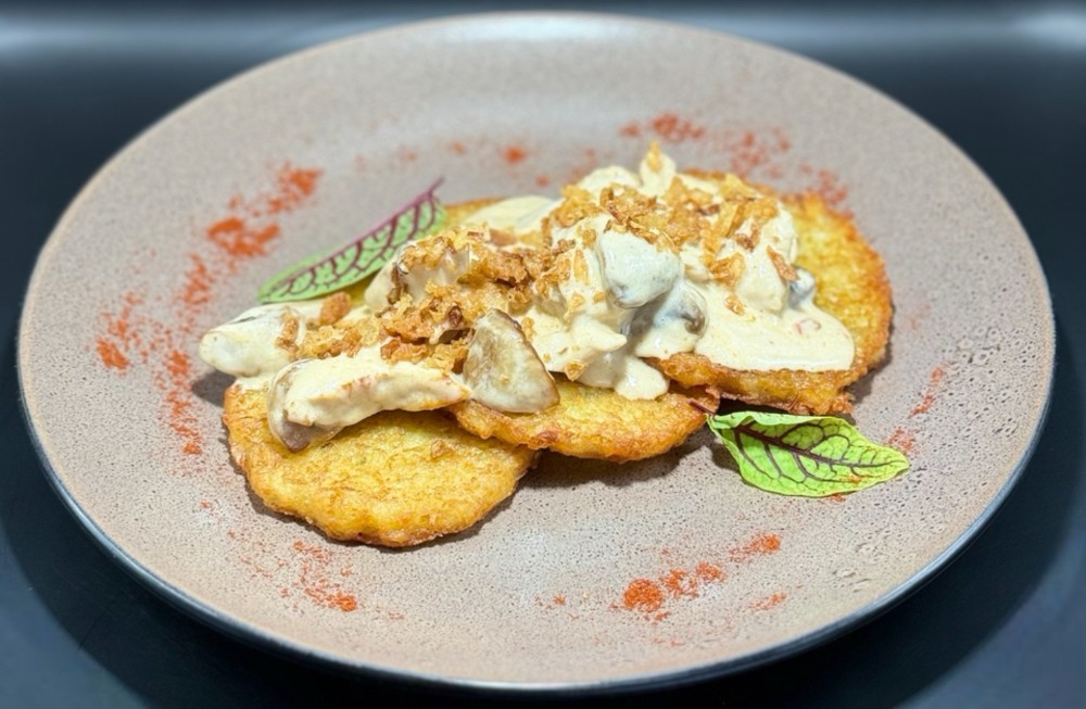 Деруни з лососем, крем-сиром та яйцем "пашот"