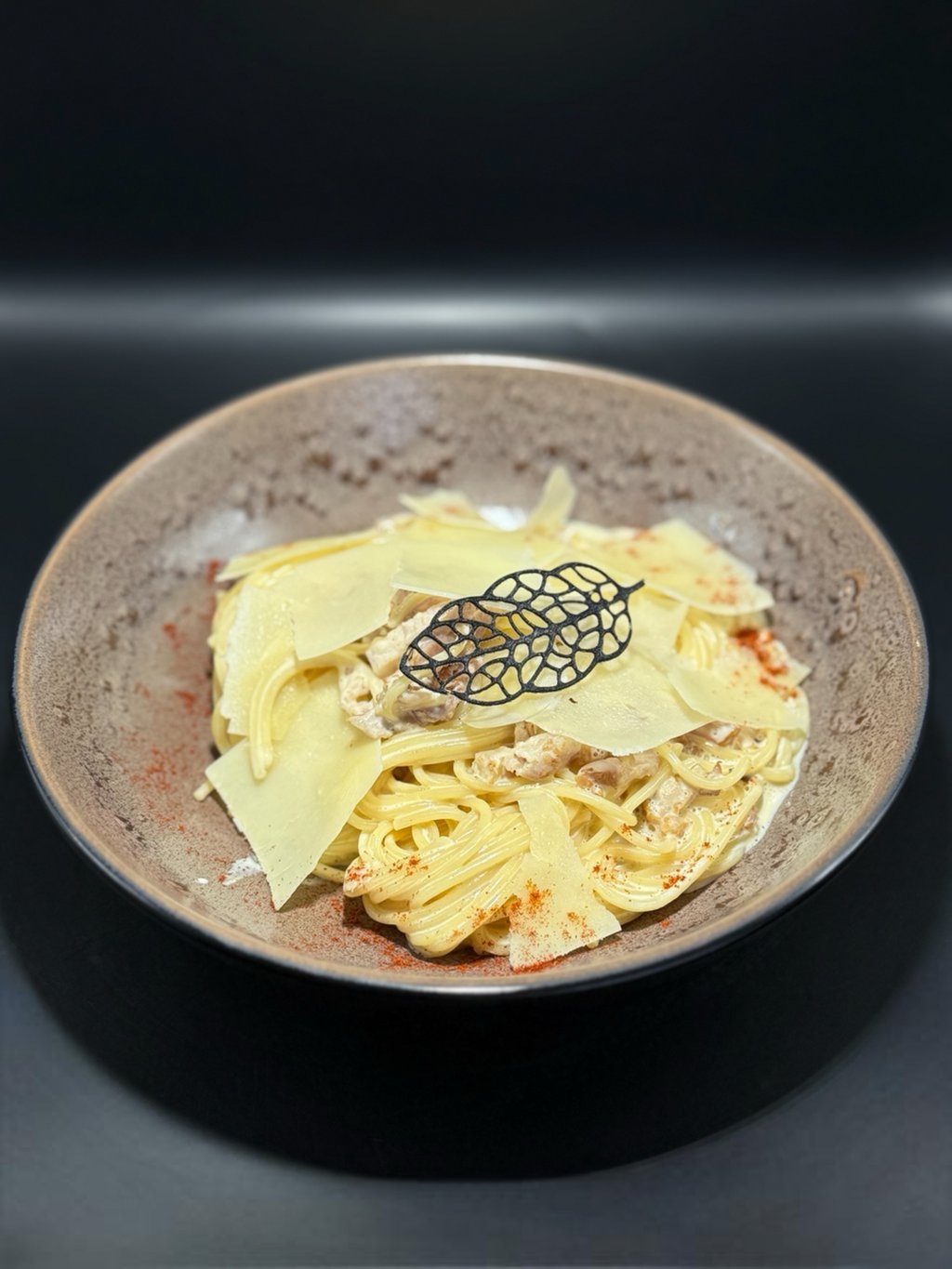 Паста з телятиною су-від та грибами під соусом Чеддер